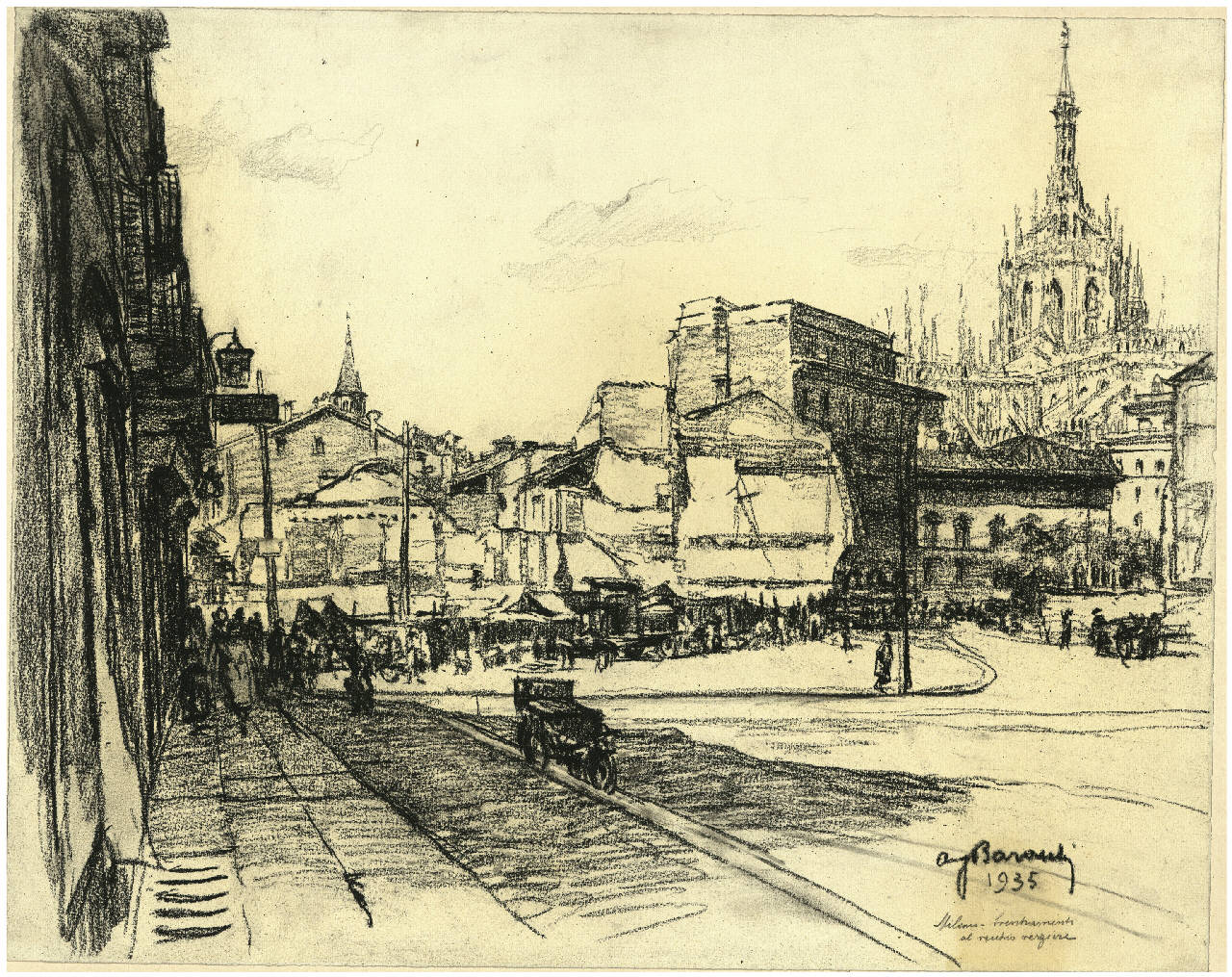 - NOTIZIE STORICO CRITICHE Il disegno raffigura la demolizione della manica sinistra in piazza Duomo. Sullo sfondo è riconoscibile il Duomo di Milano e l'ingresso della Galleria Vittorio Emanuele II.