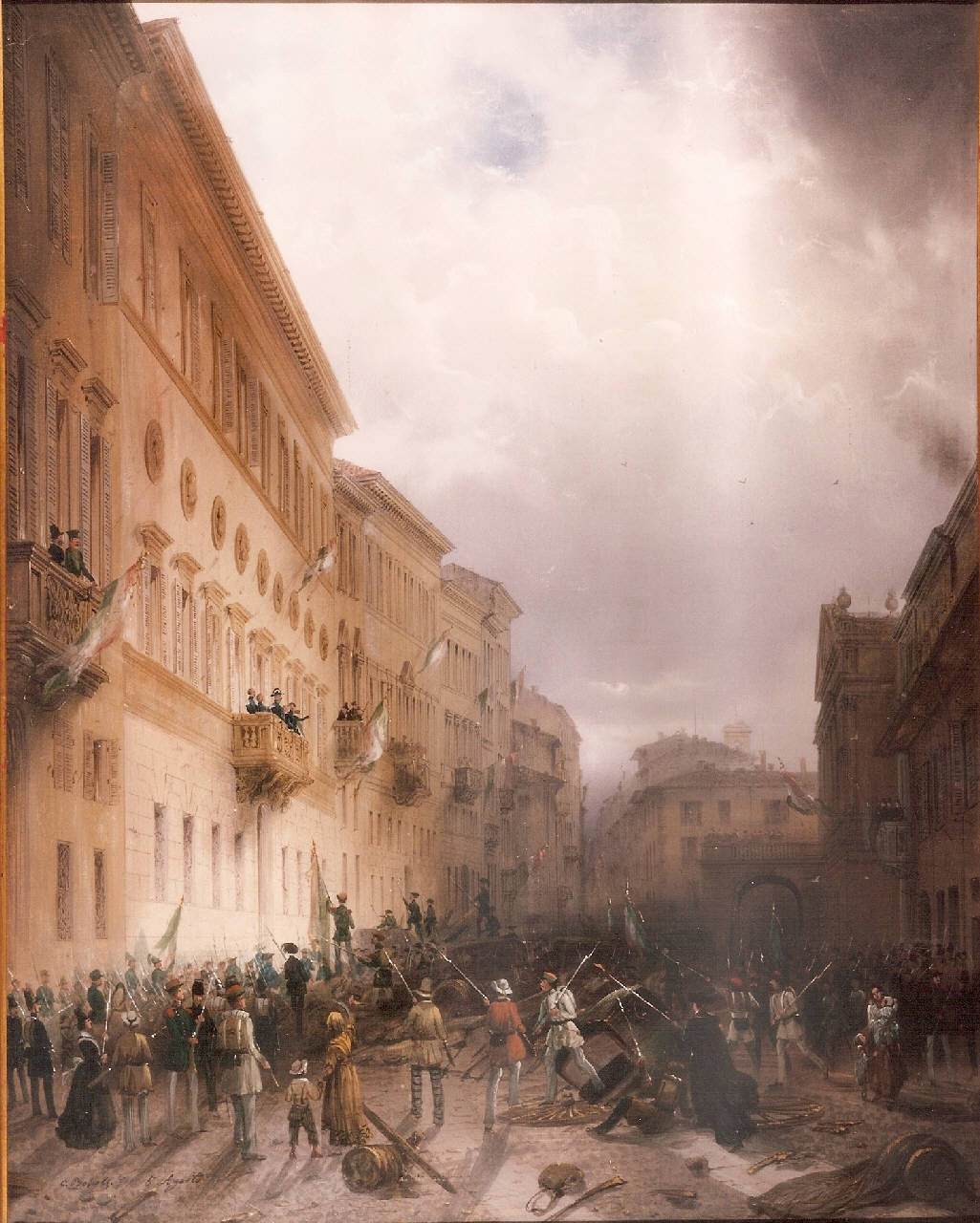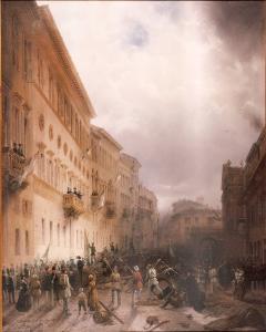 - NOTIZIE STORICO CRITICHE Dipinto con episodio narrativo: figure umane in piccolissima scala immerse nel contesto urbano della città di Milano. Siamo nel 1848: Carlo Alberto al balcone di casa Greppi viene minacciato dai milanesi che non vogliono la resa della città.\nL'opera è stata commissionata da Gian Martino Arconati Visconti.