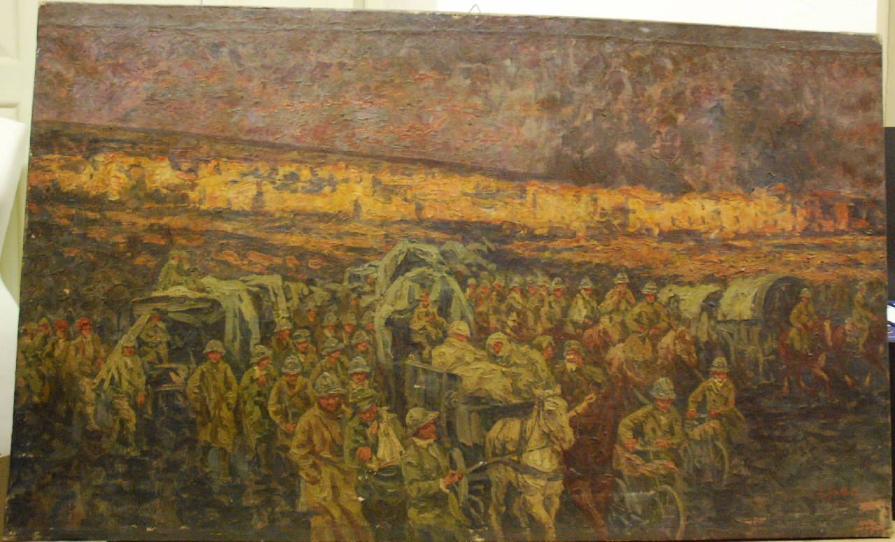 - NOTIZIE STORICO CRITICHE Il dipinto raffigura la Marcia della III Armata in ritirata sulla strada di S. Martino del Carso