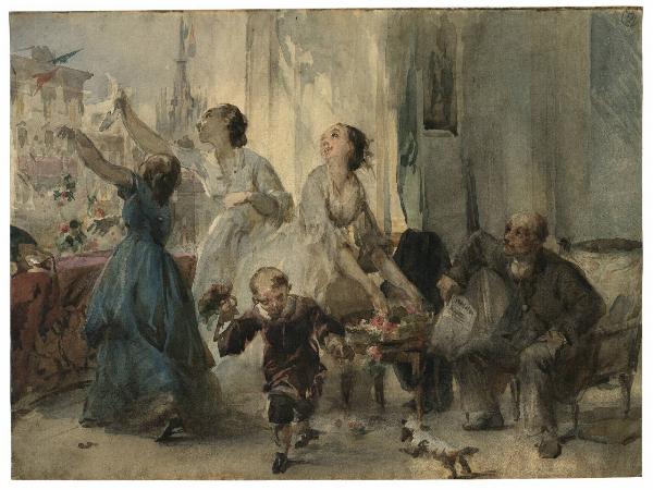 Scena patriottica di famiglia sul terrazzo mentre applaude ad un corteo. Si intravedono elementi architettonici e vedute, tra questi probabile il Duomo di Milano.