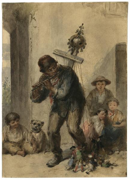 Scena con suonatore con bambini mentre agita le marionette. Nella scena sono presenti quattro bambini e un cane. Alle loro spalle si intravede un arco a tutto sesto e una Porta o Finestra in legno.
