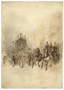 Veduta di un corteo con uomini a piedi, sulla destra compare una carrozza trainata da due cavalli. il disegno è realizzato su carta con acquarellatura color seppia. Nella scena si intravedono elementi architettonici.