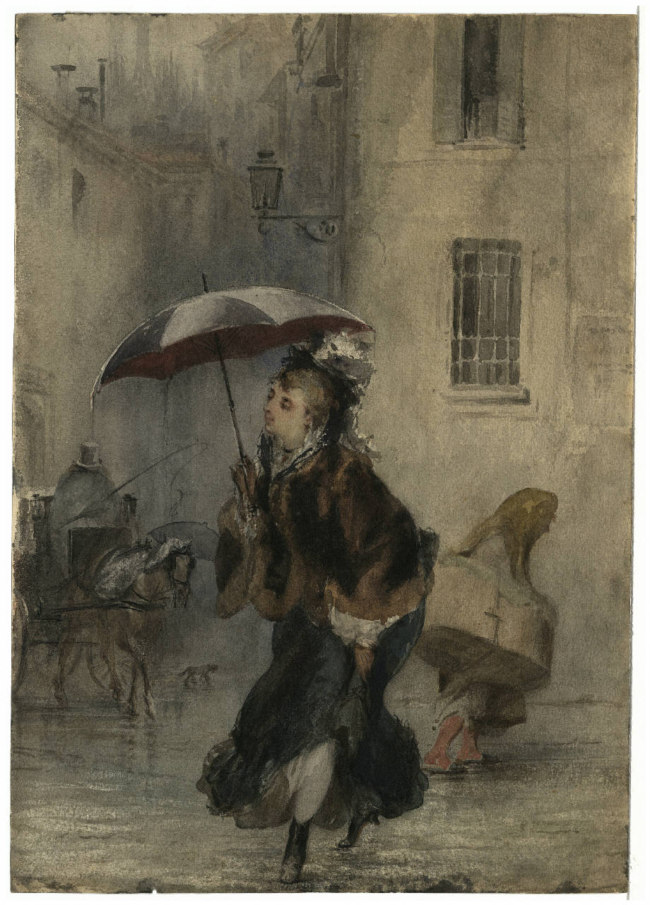 Donna con ombrello, nella scena compare una carrozza trainata da cavallo e una mendicante. Nel disegno compaiono vari elementi architettonici e palazzi.