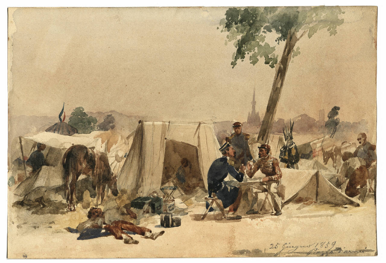 Disegno ad acquarello con scena storica datata al 25 Giugno 1859 in Piazza D'Armi, come indicato nell'iscrizione che compare in basso a destra. Nella scena sono presenti le truppe in un momento di riposo. In lontananza si intravede la città.