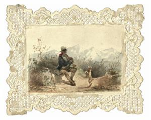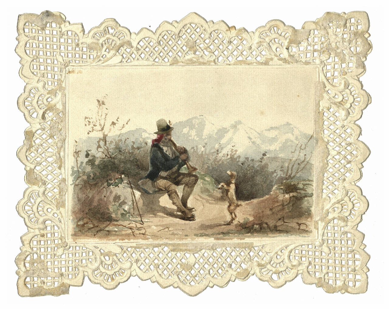 Disegno ad acquarello su carta. Al centro seduto su una roccia un suonatore di piffero con il suo cane di fronte.