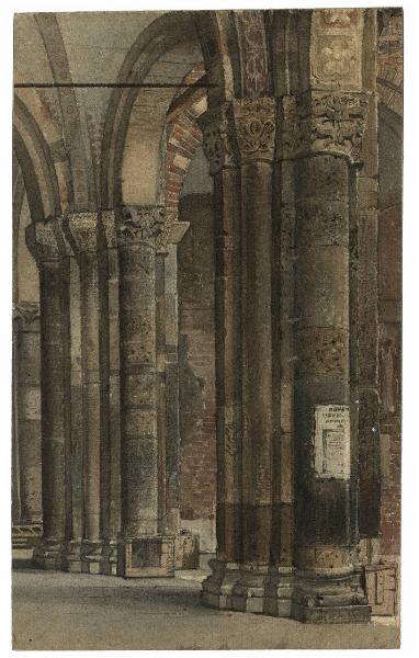 Disegno ad acquarello su carta raffigurante l'atrio della basilica di Sant'Ambrogio. Il foglio è disegnato su entrambi i lati.