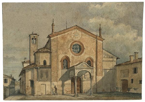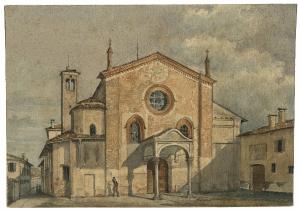 Disegno ad acquarello su carta raffigurante la chiesa di Santa Maria della Pace. Il foglio sul recto reca un disegno in stato di bozza di una struttura architettonica.