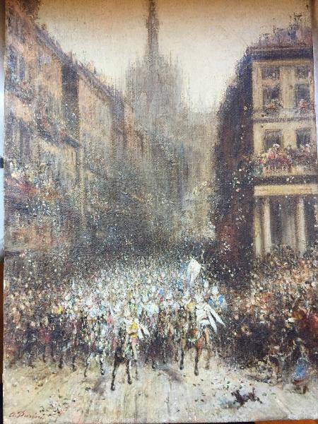 Piccolo dipinto ad olio raffigurante una cavalcata di cavalieri a Milano. Nella scena si vedono i palazzi e case con il popolo in festa sui balconi. All'orizzonte si intravede il Duomo di Milano