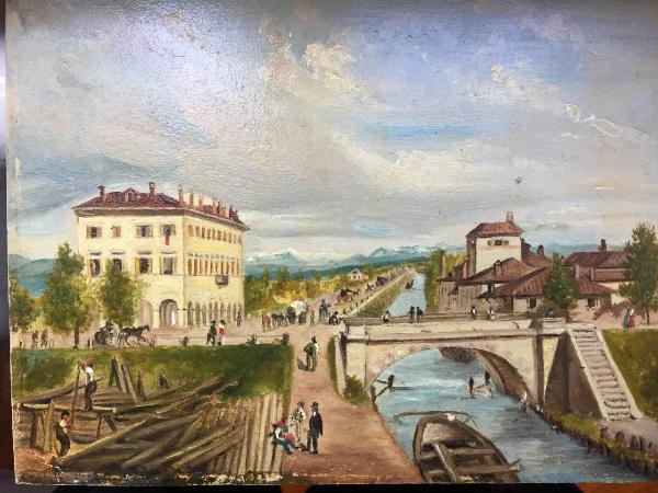 Piccolo dipinto ad olio raffigurante la veduta del Naviglio della Martesana con uomini e donne.