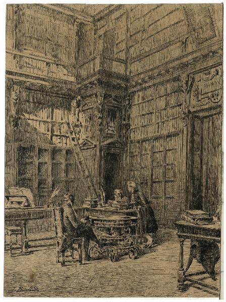 Disegno ad inchiostro raffigurante uomini e donne intenti a discutere all'intenro della Sala Antica della Biblioteca Ambrosiana
