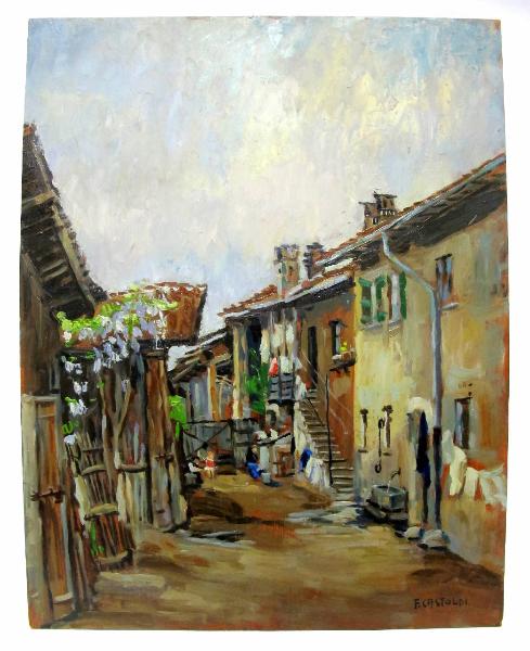 Tavola dipinta ad olio raffifurante una veduta di un cortile di Milano in zona Porta Ticinese