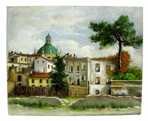 Tavola dipinta ad olio raffifurante una veduta di Milano in Via Vetere