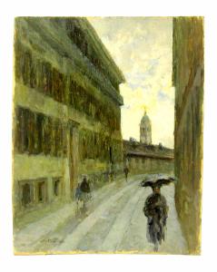 tavola dipinta ad olio raffifurante una veduta di Milano, Via Annunciata, Via Borgonuovo nel 1905