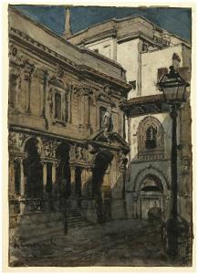 Disegno realizzato su carta con acquarello, raffigurante uno scorcio di Milano.