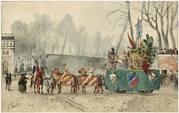 Disegno raffigurante una scena del carnevale ambrosiano a Milano. Nella scena sono presenti a destra un carro con fiori e stendardo del Comitato del Carnevale e a sinistra alcuni uomini a cavallo.