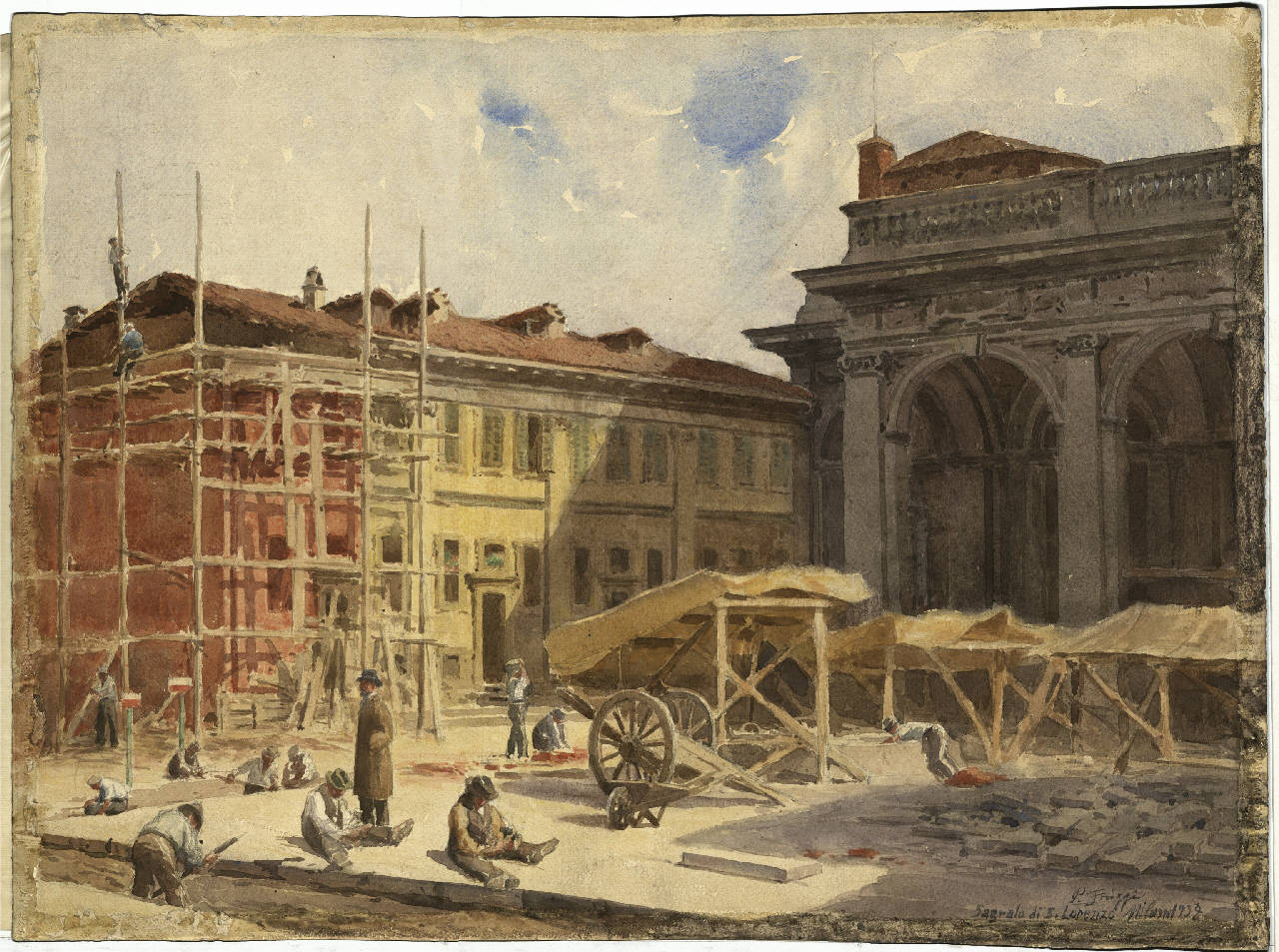 Disegno raffigurante il sagrato di San Lorenzo a Milano con alcuni uomini che lavorano
