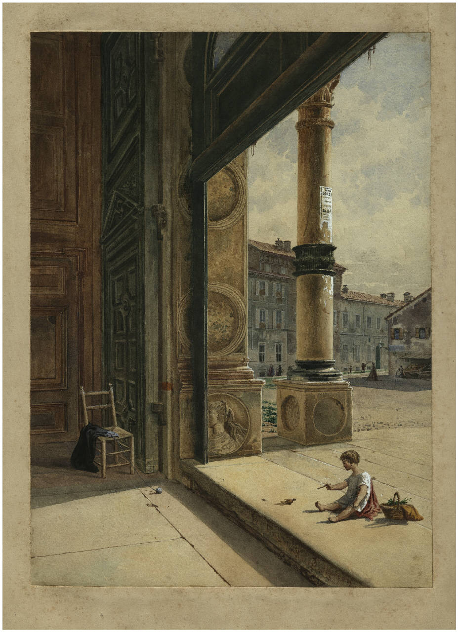 Disegno ad acquarello raffigurante la veduta di piazza Santa Maria delle Grazie ripresa dalla soglia della Chiesa, in primo piano un bambino che gioca.