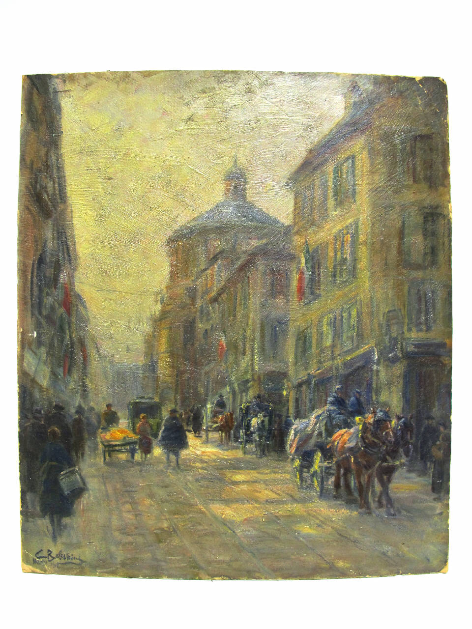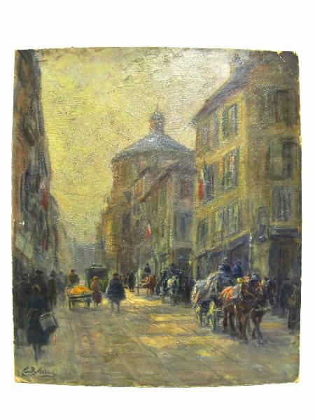 Il dipinto raffigura Via Torino nel 1918, si riconsce il Tempio Civico di san Sebastiano