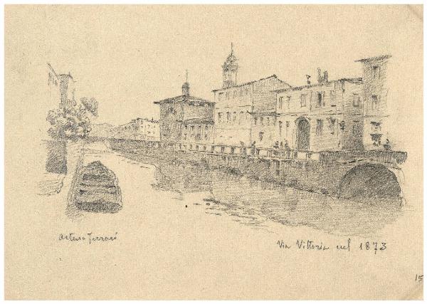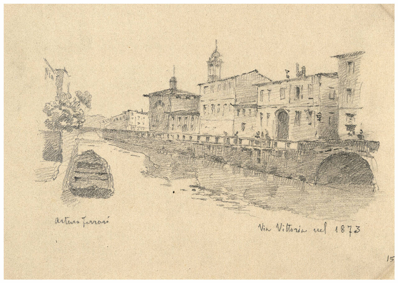 Disegno a matita raffigurante la veduta di Via Vittoria nel 1873\nIl disegno si trova all'interno di un album contenente una raccolta di disegni di Arturo Ferrari.