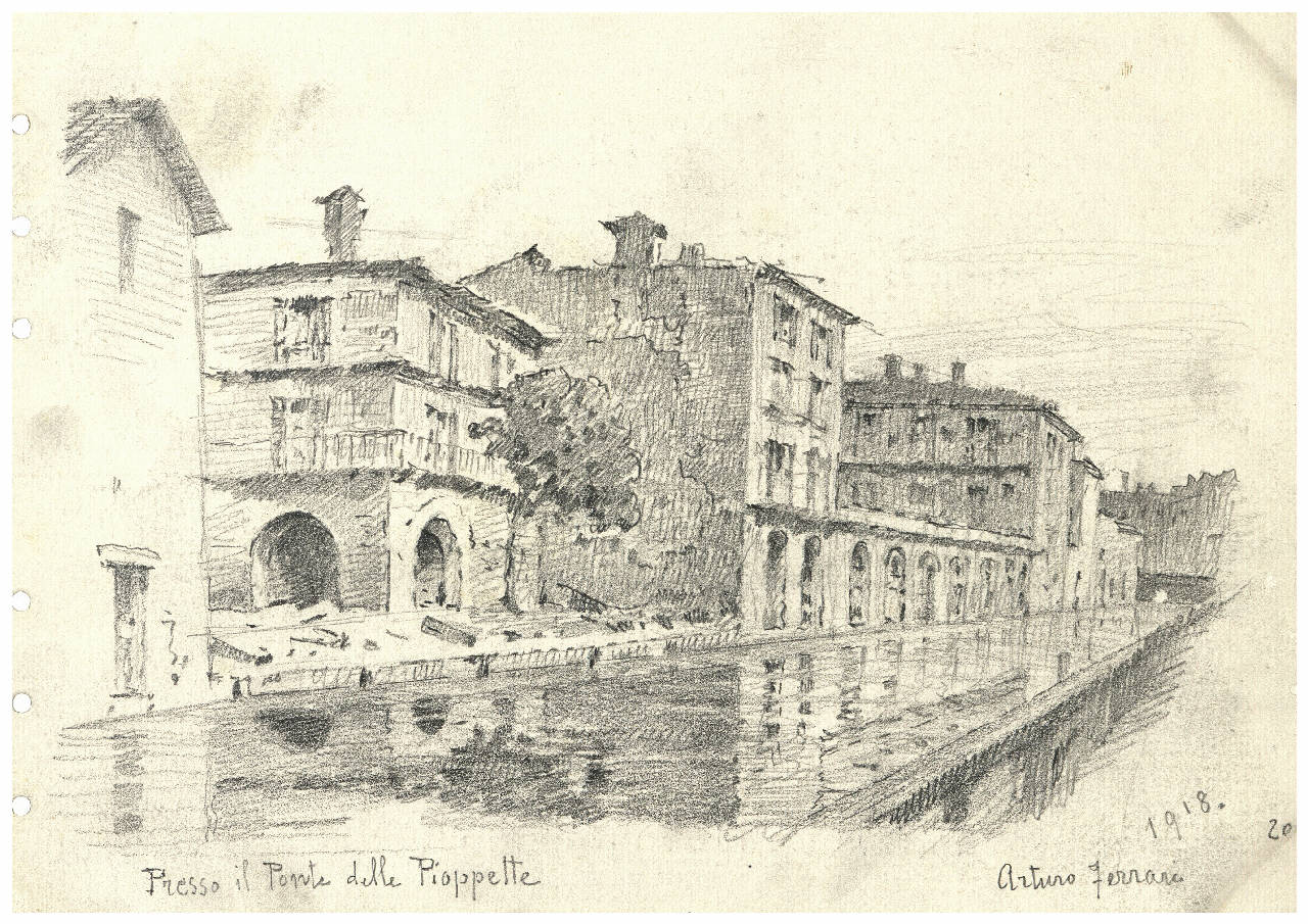 Disegno a matita raffigurante il Ponte delle Pioppette nel 1918\nIl disegno si trova all'interno di un album contenente una raccolta di disegni di Arturo Ferrari.