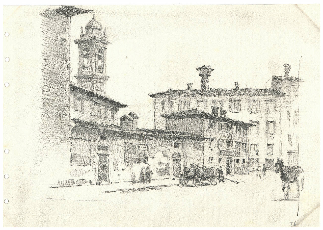 Disegno a matita raffigurante Via Laghetto con il Campanile di S.Stefano \nIl disegno si trova all'interno di un album contenente una raccolta di disegni di Arturo Ferrari.