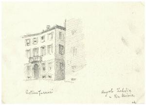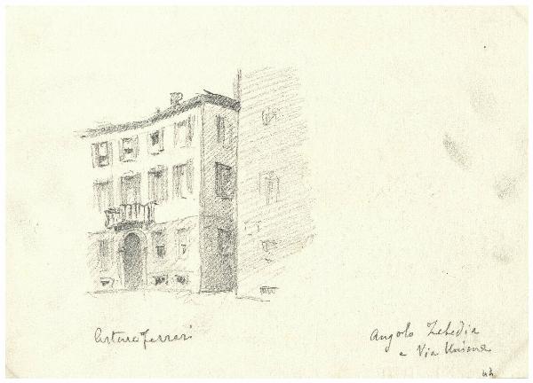 Disegno a matita raffigurante l' angolo Zebedia e Via Unione\nIl disegno si trova all'interno di un album contenente una raccolta di disegni di Arturo Ferrari.