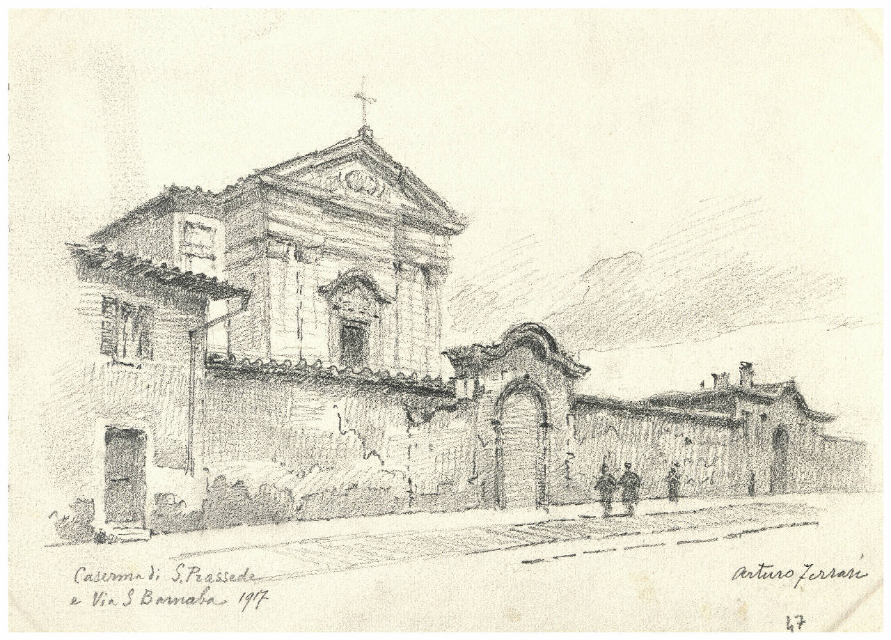 Disegno a matita raffigurante la Caserma di S. Pressede e Via San Barnaba\nIl disegno si trova all'interno di un album contenente una raccolta di disegni di Arturo Ferrari.