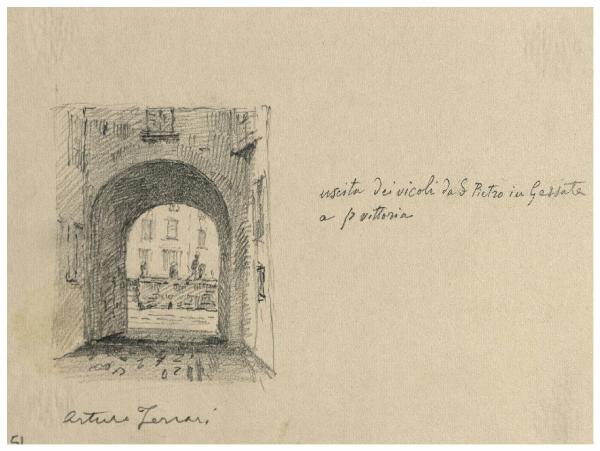 Disegno a matita raffigurante la veduta dei vicoli di San Pietro in Gessate verso Porta Vittoria \nIl disegno si trova all'interno di un album contenente una raccolta di disegni di Arturo Ferrari.