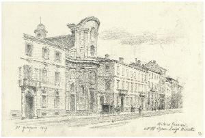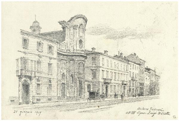 Disegno a matita raffigurante Via Durini, dove sono ubicate Casa Toscanini e la Chiesa dei Crociferi\nIl disegno si trova all'interno di un album contenente una raccolta di disegni di Arturo Ferrari.