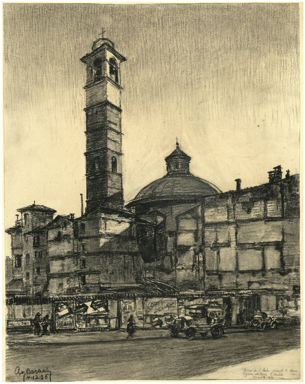 disegno a carboncino raffigurante la Chiesa di San Carlo durante le demolizioni al largo San Babila