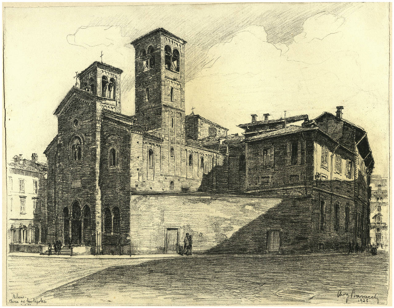 disegno a carboncino raffigurante la veduta della Chiesa di San Sepolcro a Milano