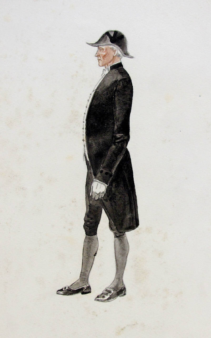 L'acquarello raffigura un valletto di profilo in abito nero.