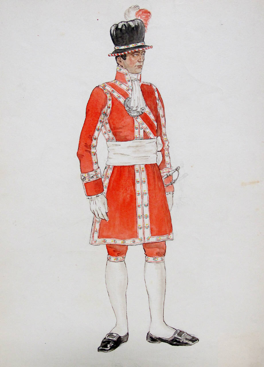 - NOTIZIE STORICO CRITICHE Sul retro del foglio è riportato il numero di Registro di carico del Museo di Milano: 745\nI disegni sono accompagnati da documentazione dattiloscritta del Podestà di Milano, anno 1933 o 1935 (la data 1933 è sostituita con nota manoscritta con il 1935), numero di Protocollo Generale 147/626.\nIl documento informa che il Comune di Milano ha disposto la rappresentazione grafica di 18 figurini con uniformi della tradizione milanese.