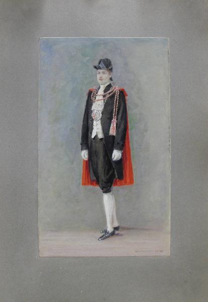 L'acquarello raffigura un valletto con uniforme nera e mantello rosso.