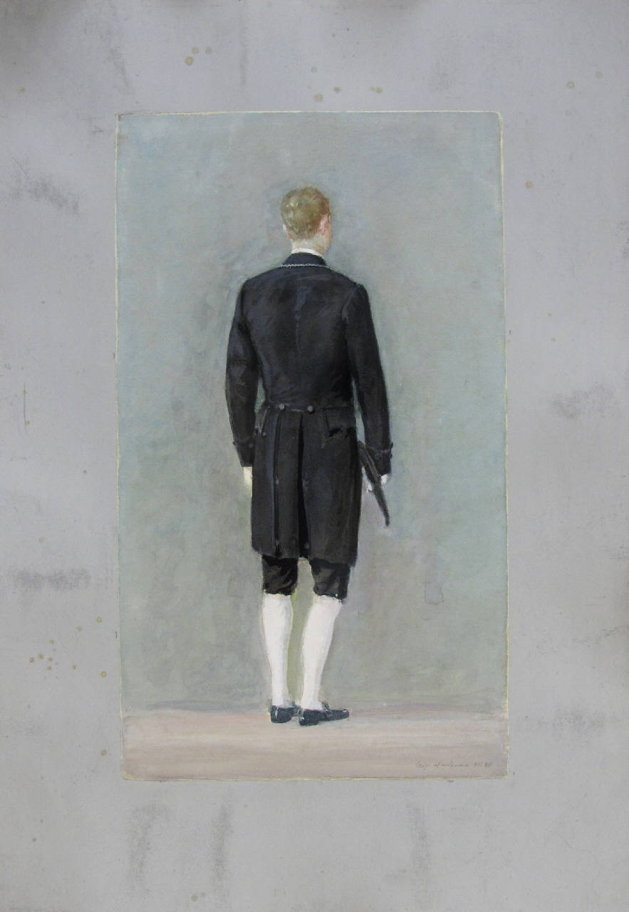 L'acquarello raffigura un valletto con uniforme nera.