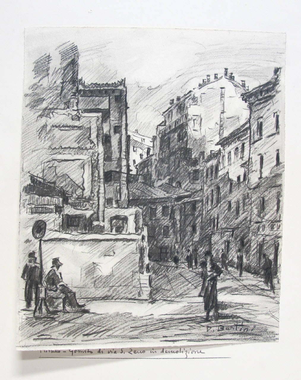 Disegno a carbonccino su carta raffigurante le demolizioni in via San Zeno
