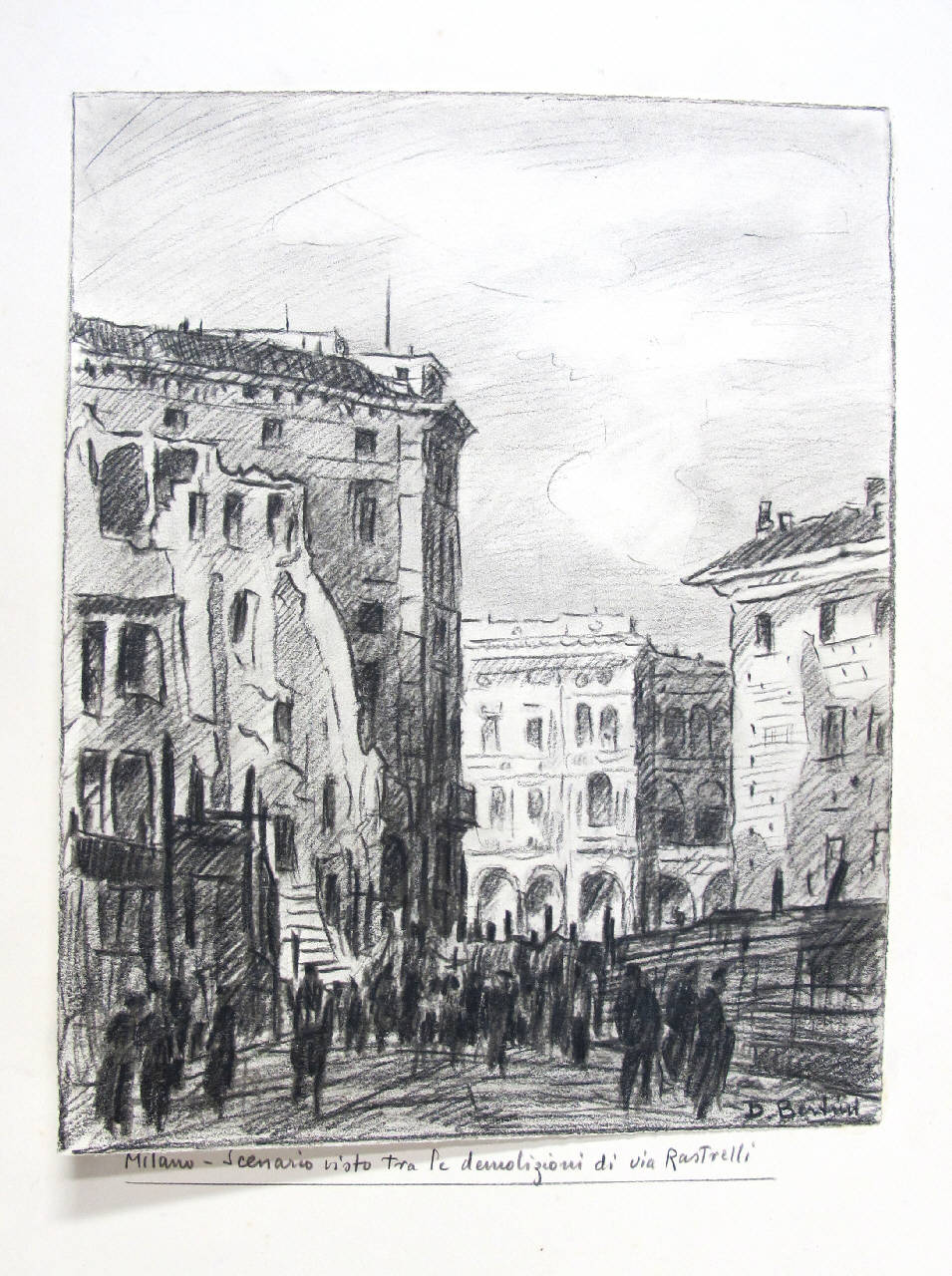 Disegno a carbonccino su carta raffigurante lo scenario visto tra le demolizioni in Via Rastrelli a Milano