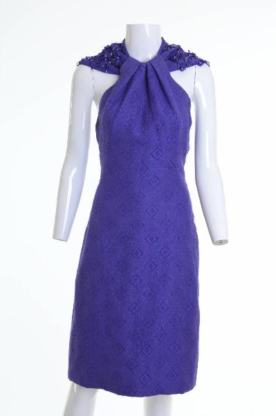 L'abito intero aderente con gonna diritta ha il giromanica all'americana sul davanti e una scollatura totale a punta sulla schiena.\nIl dietro, in un telo, è sagomato da una pince centrale sotto la scollatura cui sono applicati due piombini. Il davanti è confezionato in un telo la cui ampiezza viene ridotta sia da due tagli verticali che iniziano in vita e formano una parte centrale triangolare sia da alcune pieghe al collo.\nUna mantellina a forma di triangolo curvilineo dello stesso tessuto in sbieco e doppiato copre parzialmente la scollatura del dorso e si allaccia sotto il drappeggio anteriore. È totalmente coperta da un ricamo ad applicazione progettato per dialogare in modo originale con il tessuto nel rilievo e nei colori: sottolinea con segmenti sottili di perline di vetro l'intreccio a stuoia, al centro del quale si ripetono motivi circolari a ciuffi fortemente tridimensionali, realizzati accostando diversi materiali e forme, quali gocce di vetro, paillettes, cristalli incastonati, jais e perline, in una varietà attentamente ricercata di toni tra il rosa e il viola, con piccoli tocchi di nero.\nIl perfetto calcolo del peso del tessuto doppiato e del ricamo consente alla mantellina di non subire deformazioni pur sostenendo tutto l'abito.\n[Cfr. bibliogr. descriz. compl]