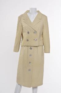 Il tailleur è composto da giacca e gonna. La giacca doppio petto con collo a revers scostato è a sacchetto sul dietro e leggermente sagomata con due pinces sul davanti.\nÈ confezionata con tre teli, il posteriore dei quali comprende anche le maniche che risultano a kimono sul dietro e a giro sul davanti. Un triangolo sottoascella ne completa la vestibilità.\nL'allacciatura è costituita da quattro grossi bottoni di madreperla e un automatico ricoperto nascosto.\nLa gonna di linea diritta è sagomata in vita con pinces. Sul davanti presenta una piega che simula una sovrapposizione a portafoglio sottolineata da quattro bottoni di madreperla.\nAllacciatura con cerniera sul fianco sinistro.