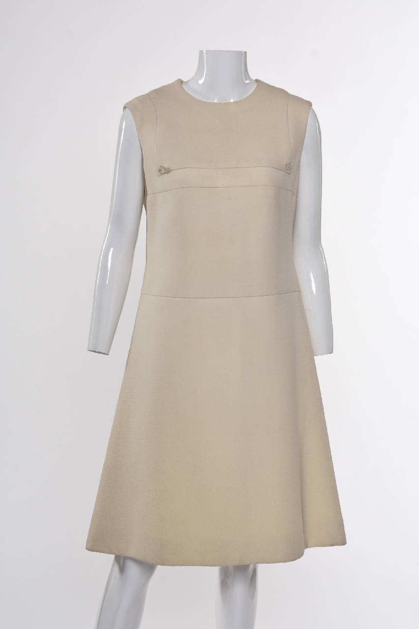 Abito tagliato a vita bassa, di linea diritta leggermente svasata nella gonna, senza maniche e girocollo.\nIl modello è concepito in tre fasce orizzontali di tessuto singolarmente foderate che segnano la linea del seno e il giro vita. Sul davanti, intorno al collo, un intarsio a forma di rettangolo con i lati arrotondati simula una pettorina fermata da due bottoni di madreperla.\nAllacciatura con cerniera nel dorso.