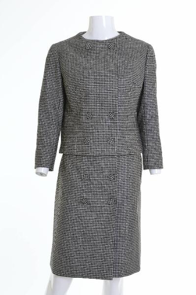 La giacca corta doppiopetto con collo a giro e maniche a tre quarti è leggermente sagomata sul dorso e presenta linces sul davanti. L'allacciata con automatici nascosti è simulata all'esterno con quattro bottoni ricoperti collocati in vita e due al collo.\nLa gonna diritta a vita bassa e confezionata a portafoglio presenta all'interno una sottogonna intera di taffetas. L'allacciatura è costituita da ganci in cintura, una cerniera nella sottogonna e quattro automatici nascosti nel sormonto del portafoglio. Quattro bottoni ricoperti applicati sul davanti hanno funzione decorativa.
