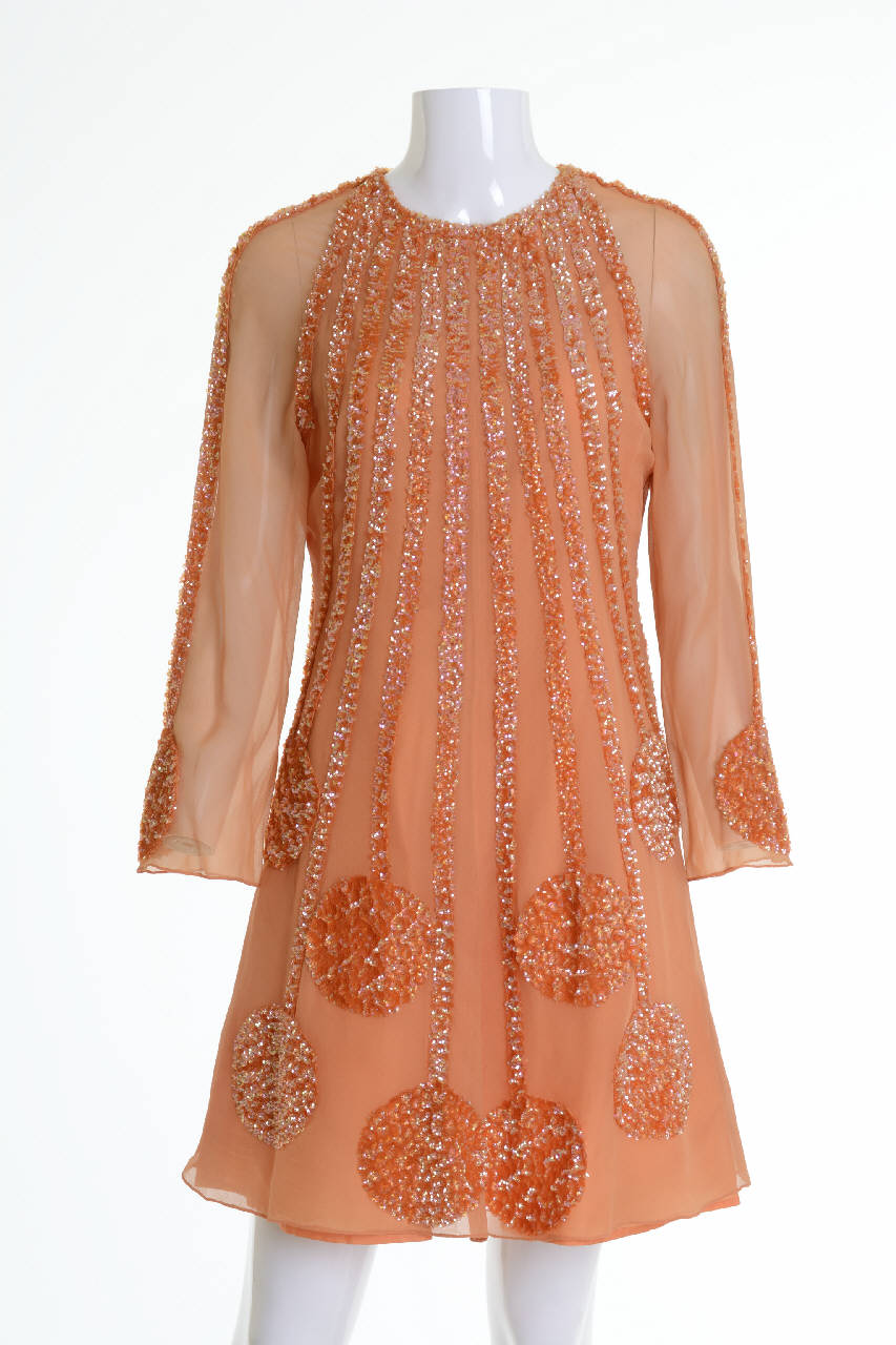 L'abito intero di linea diritta leggermente modellata sui fianchi è confezionato in quattro teli. Il collo è a giro e le maniche lunghe a raglan sono svasate.\nIl modello è caratterizzato da un motivo a raggera di nastri di diversa lunghezza che dal collo scendono fino alla gonna e ai polsi terminando con cerchi. La decorazione, ricamata su una base di chiffon ritagliata nella forma del disegno, è cucita a mano sull'abito.