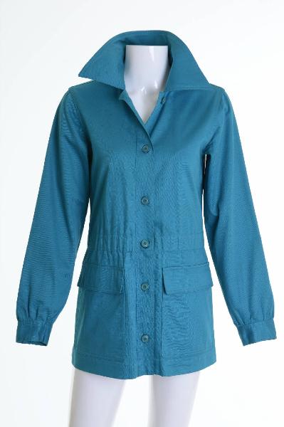 La giacca, di foggia maschile a un petto, è diritta e lunga. Confezionata in tre teli, ha i davanti doppiati con lo stesso tessuto. Il colletto è a camicia con solino posteriore e le maniche lunghe sono chiuse con un polsino abbottonato. Nella parte posteriore delle spalle presenta un taglio a carré. In vita è stretta con un alto elastico a coulisse. Sul davanti, due tasche applicate con patta.\nAbbottonatura centrale sul davanti.