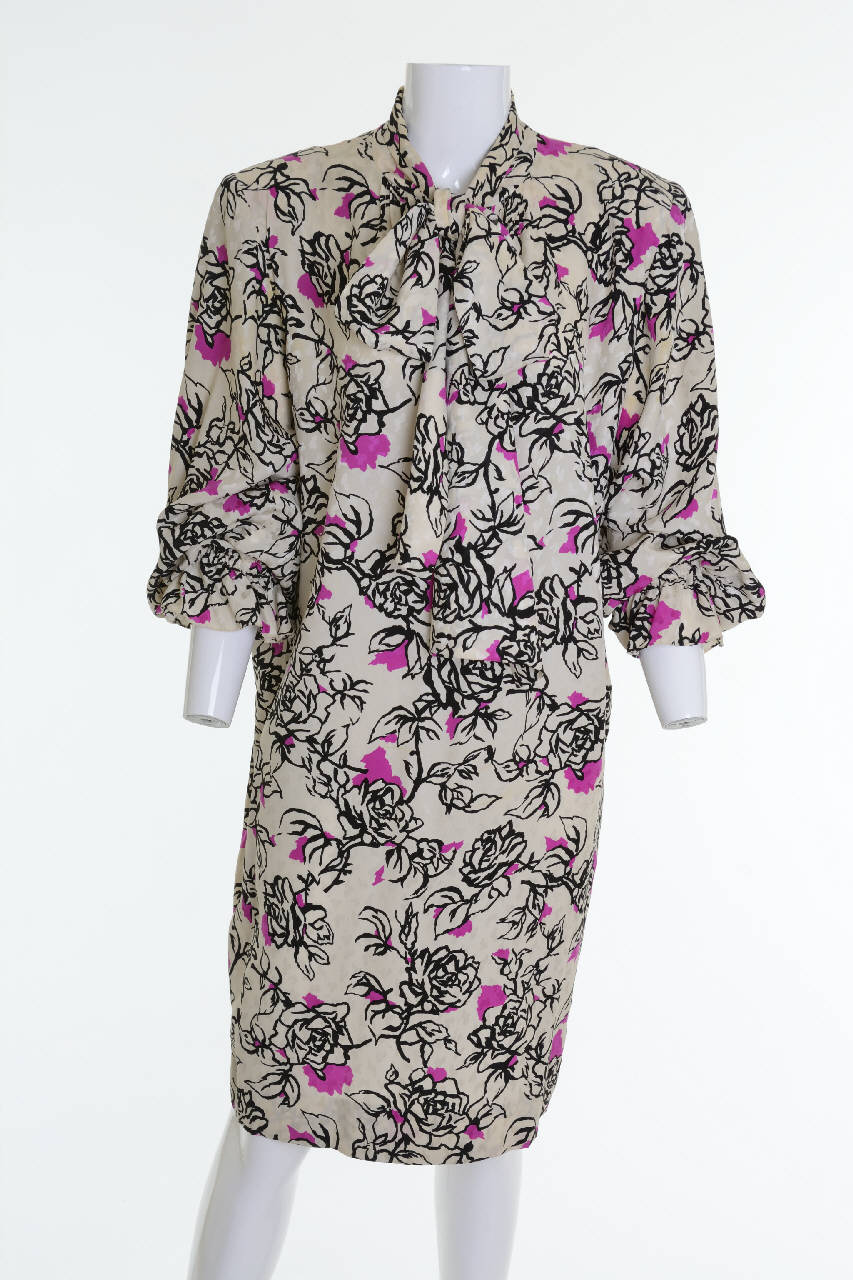 L'abito intero di linea diritta e fluida è confezionato in due teli. Al collo presenta una breve apertura e un colletto a nastro che si annoda sul davanti a formare un grosso fiocco. Le spalle diritte sono imbottite e le maniche lunghe sono chiuse al polso con un elastico a coulisse che produce una piccola ruche. Ai lati del collo sul davanti e alla nuca, gruppi di piegoline parzialmente cucite danno ampiezza al capo.