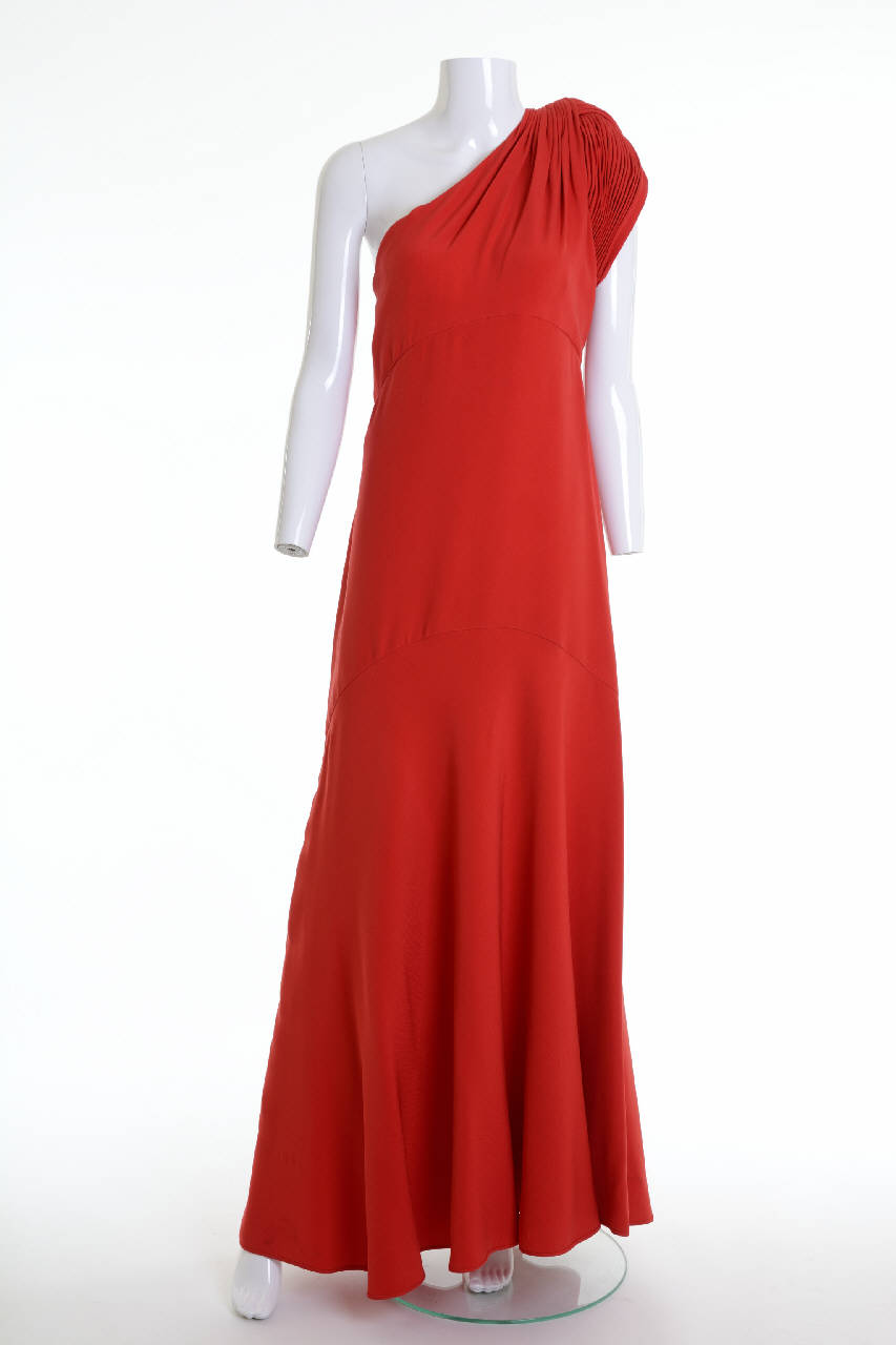 L'abito intero lungo di linea a sirena è tagliato a vita alta e al ginocchio. I teli anteriore e posteriore del corpetto, foderati di organza, sono concepiti in modo da lasciare la spalla destra scoperta e avvolgersi su quella sinistra formando un drappeggio fittamente cucito che crea una breve manica.\nLa spalla è sostenuta con una spallina imbottita foderata di organza.\nLa parte alta della gonna, doppiata di crêpe rosso e con rinforzi di organza, è di linea aderente sui fianchi, per allargarsi a mezza ruota all'orlo.\nAllacciatura con cerniera sul fianco sinistro e cintura di gros in vita.