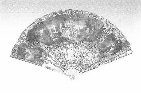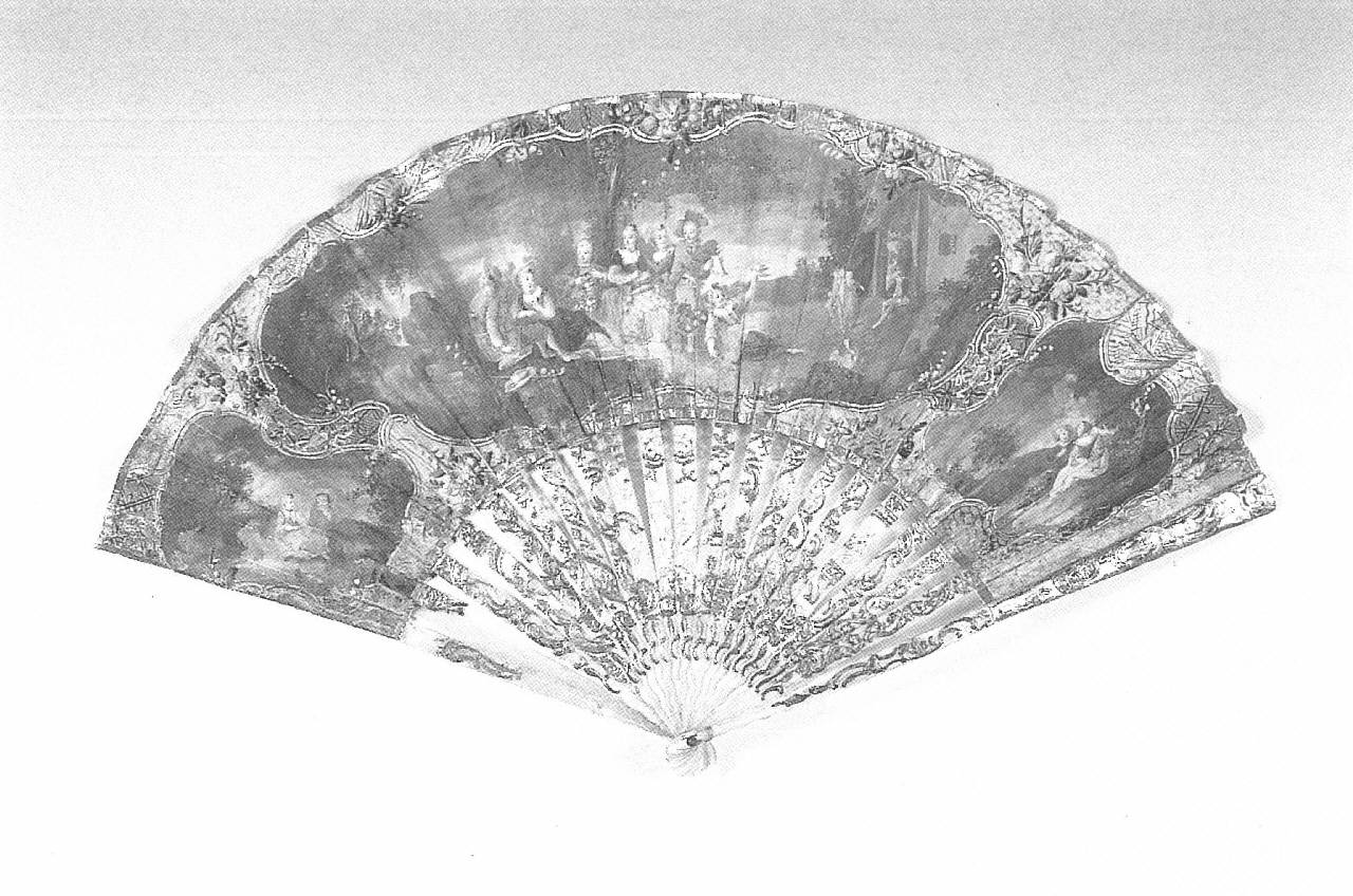 - NOTIZIE STORICO CRITICHE Ventaglio da fidanzamento, come suggeriscono la presenza allusiva della gabbia e dell'uccellino, e la dimensione idillica dei soggetti dipinti; anche i due pescatori sono da leggere probabilmente come metafora della "cattura" dell'amato bene.\nApparteneva alla marchesa Margherita Pallavicino, figlia del conte Giacomo Durini di Monza.