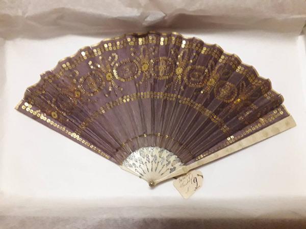 Ventaglio pieghevole, stecche in osso traforate e ageminate a motivi vegetali; rivetto in metallo ribattuto; occhiello in osso; pagina in raso di seta color malva con applicazioni di paillettes e tondini dorati fissati con filo rosso; al verso rivestimento in garza viola. Le stecche di guardia, lisce e a spatola, recano tracce della colla su cui dovevano essere fissate nove roselline ageminate (ne resta parte del contorno) che punteggiavano la superficie. Il campo dell apagina, che già si impone per il colore deciso del tessuto, è decorato nella parte superiore da un'alta fascia delimitata da un doppio ordine di paillettes binate al cui interno ovali, con al centro un fiore quadrilobato, si alternano ad un ovale più piccolo con paillettes al centro. Tutti gli ovali sono uniti tra loro da un triplice fiocco e da un dischetto nei punti di tangenza.