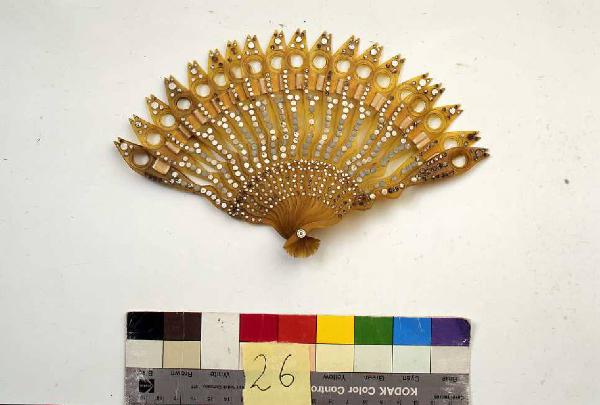 Vebtaglio brisé ad occhialino. Venti stecche in tartaruga bionda intagliate, a sagoma sinuosa terminanti a becco d'uccello, fornite ognuna di un foro e decorate con applicazioni di dischetti metallici di grandezza diversa; mancano le lenti che dovevano avere le stecche di guardia e che trasformavano il ventaglio in un occhialino. Nastro di gros di seta rosa cipria; rivetto in ottone, occhiello in madreperla.\nL'aspetto curioso dell'esemplare è dato dalla morfologia a serpente che assume una volta chiuse tutte le stecche.