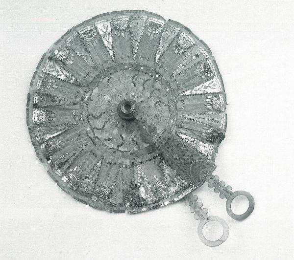 Ventaglio a coccarda ad occhialino. Diciassette stecche in corno biondo trasparente intagliate, traforate e ageminate con foglioa metallica dorata e dischetti d'acciaio; estremità dipinte in azzurro. Stecche maestre a spatola con impugnatura dentata e anello terminale, minutamente traforate a tralci floreali; si allargano in due tondi di diversa misura sovrapposti, traforati e ageminati.Rivetto in metallo fornito di lente.\nPagina in organza di seta su trasparente cartaceo azzurro e carta pergamena al verso. La decorazione è formata da triangoli di lamina metallica dorata con, sovrapposte alternatamente, stelle, foglie, frecce e brevi festoni di paillettes e semicupolette dorate. La pagina è foderata con carta pergamena che purtroppo indurisce il ventaglio e non ne consente più la chiusura.\nVentaglio tipico del periodo napoleonico, come denotano la piccola dimensione e i materiali poco costosi; se ne conoscono esemplari soprattutto "brisés". Veniva facilmente inserito nelle "reticules" e poteva essere trasformato in occhialino.