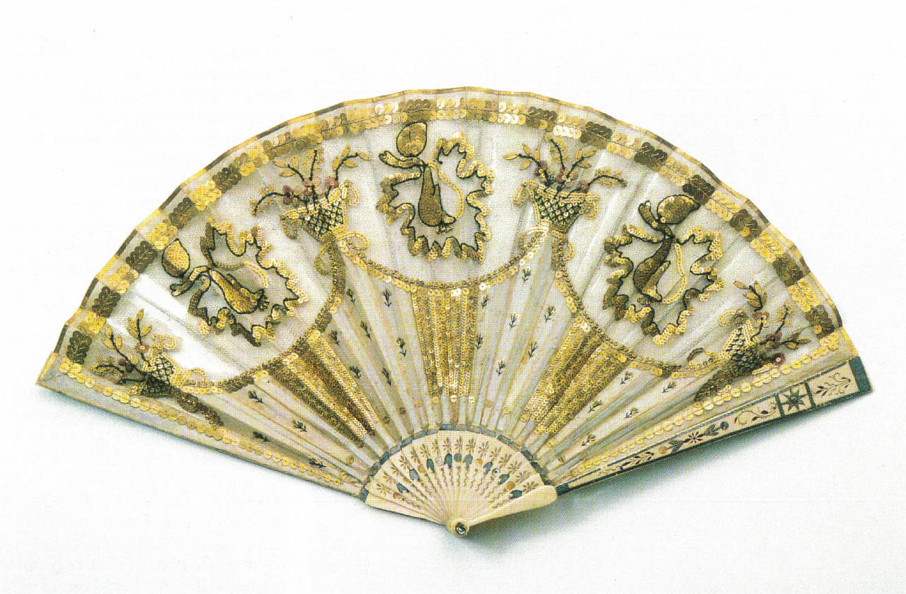 Ventaglio pieghevole. Diciotto stecche in avorio traforate ed ageminate con lamina dorata, estremità tinte in azzurro. Guardie terminanti a spatola tronca, traforate a sottili motivi vegetali in parte ageminati come il profilo della stecca e, in alto, la stella a otto punte isolata in un quadrato. Al vereso sulla stecca di guardia di sinistra è scritto a penna in alto "4.15". Lungo le stecche interne si ripetono su due ordini mitivi vegetali a traforo stilizzati, divisi da un giro di foglioline ageminate alternate a dischetti d'acciaio.\nIntrodure di tulle su cui sono disposti a distanza regolare quattro vasi da giardino da cui fuoriescono fiorellini rosa e rametti fogliati, ricamati con paillettes dorate e filo rosa e nero, che scandiscono tre campiture uguali concluse in basso da festoni in paillettes discendenti simmetricamente dalla base dei vasi, con all'interno ricamate con paillettes dorate e filo nero tre pere appoggiate al centro di una foglia di vite. Dal centro dei tre festoni scende, sulla sezione in taffetas di seta azzurrina, una fascia larga e compatta di paillettes dorate; zone intermedie decorate da un seminato di fiorellini ricamati con paillettes e filo nero. Bordo di finizione in carta dorata; occhiello in cristallo di rocca incastonato in alveolo di metallo.